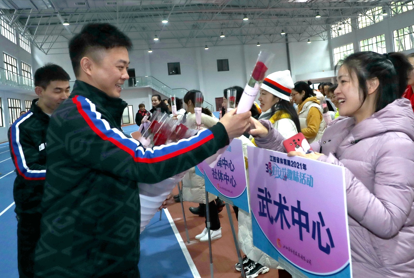 趣味賽特設暖男獻花環節,為每一位參賽者送上鮮花,感謝她們一年來辛勤付出,為江西體育事業發展做出了積極貢獻。本次三八節趣味賽拓寬了省體育系統女干部職工的業余文化生活,團結引領廣大女干部職工立足崗位、爭創一流,以更加飽滿的熱情參與江西體育事業大發展。