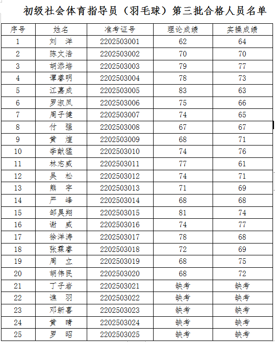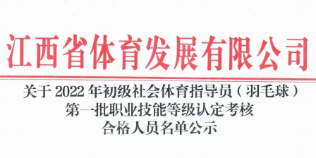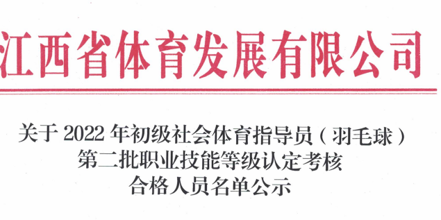 關于2022年初級社會體育指導員(羽毛球)第三批職業技能等級認定考核合格人員名單公示 根據《江西省人力資源和社會保障廳關于公布江西省第...