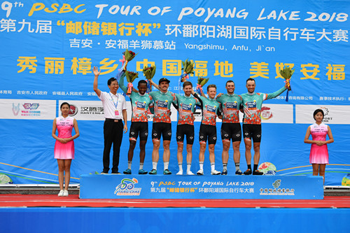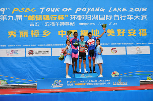 本賽段賽道全程16公里,是本屆環鄱賽設置的最短賽程。來自德國助力車隊的選手阿德內?威廉簡僅用35分38秒完成比賽,奪得了本賽段的冠軍。昨日獲得爬坡王(圓點冠軍衫)的厄立特里亞車隊選手耶馬內?謝加伊表現勇猛獲得亞軍并且繼續保有圓點冠軍衫。塞爾維亞CCN梅達勒車隊選手馬爾科?帕夫利察獲得季軍。荷蘭猴城樂園車隊選手馬爾滕?德容以第八名完成比賽的成績繼續保有個人總成績(藍冠軍衫)。最佳大中華(粉紅冠軍衫)和沖刺王(橙冠軍衫)獲得者均為中國熊貓CCN車隊選手彭源堂,這也是他連續三站同時穿上兩件領騎衫。
